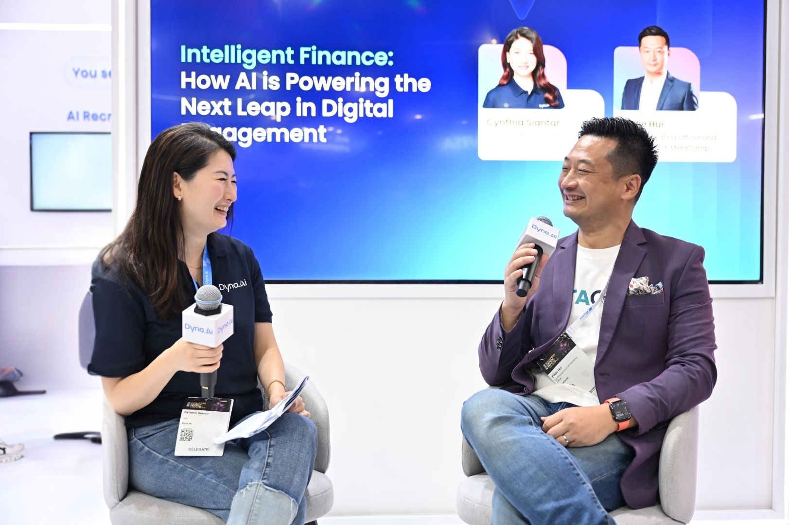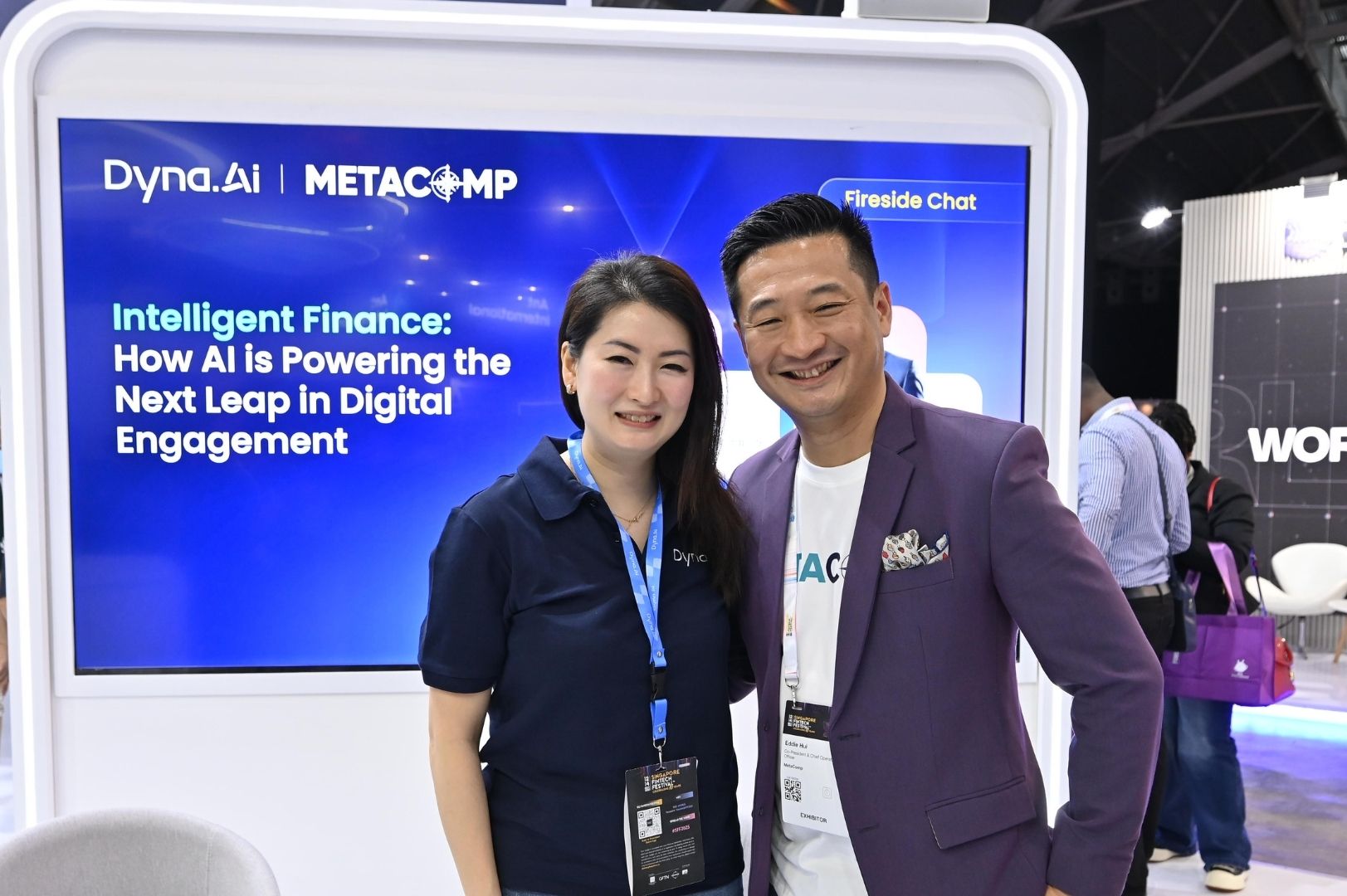 Building on discussions around AI in cross-border and embedded finance, MetaComp extended the conversation to the frontlines of customer engagement. At SFF 2025, Mr Eddie Hui, Co-President & Chief Operating Officer of MetaComp, joined Ms Cynthia Siantar, General Manager of Dyna.Ai, for a fireside chat on how AI is reshaping the future of financial services.